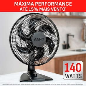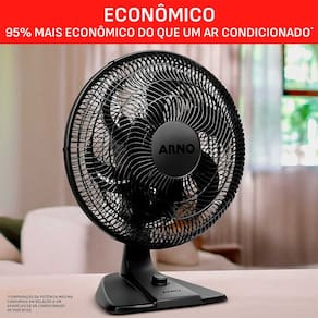 O Ventilador de Mesa Arno Essential entrega exatamente o que você precisa: mais vento, menos ruído e consumo inteligente. Com 140W de potência, é até 2x mais silencioso e proporciona 15 mais vento, para o seu bem estar em qualquer momento do dia. Além de eficiente, é também uma escolha econômica: pode ser até 95 mais econômico comparado com o ar condicionado, ideal para refrescar com consciência e praticidade. Seu design compacto e moderno se adapta facilmente ao ambiente, e a estrutura totalmente desmontável facilita a limpeza no dia a dia. Possui 3 velocidades, 80 graus de oscilação horizontal e ajuste de inclinação vertical para direcionar o fluxo de ar com precisão. Arno Essential, Tudo o que importa para você se sentir bem.