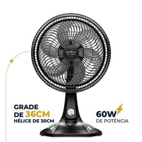 DADOS TÉCNICOS: - Voltagem: 220V - Potência: 60W - Cor: Preto - Tipo de ventilador: De Mesa ou de parede - Diâmetro da Hélice: 30 cm - Quantidade de pás: 6 pás - Velocidades: 3 - Medidas do produto (AxLxP): 55,8x36x30 cm - Peso: 1,723 kg - Garantia: 12 meses