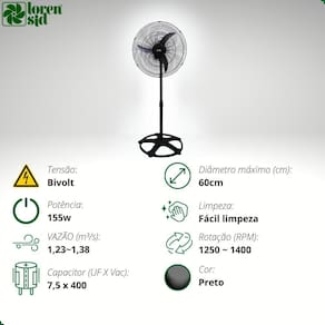 Ventilador coluna tufão sprint 60cm preto bivolt lorensid Turbo sprint 60 m3 coluna preto bivolt Com matéria prima de alta qualidade, os ventiladores lorensid possuem um excelente desempenho associado a um baixo consumo energético. Toda gama de produtos é equipada com relé térmico de proteção. Possuem um design prático e moderno e são de fácil instalação e desinstalação para limpeza. Observação: É necessário mudar a chave de tensão voltagem de acordo com a tensão da sua casa, para que o produto funcione corretamente e não queime a chave fica localizada na parte do motor do ventilador Características: - possui controle de velocidade - possui oscilação para direta e esquerda - pode ser inclinado para frente ou para trás - grade de aço removível para facilitar a limpeza - ideal para lojas, escolas, restaurantes, escritórios, igrejas, indústrias, e ambientes que exijam uma boa ventilação. Especificações: - marca: loren-sid - modelo: sprint - pás: 3 pás - tipo: ventilador de coluna/pedestal - tensão: bivolt - potência: 155w - frequência: 60hz - chave seletora: 127/220v - diâmetro da grade: 60cm - diâmetro da hélice: 52cm - consumo de energia kwh/mês : 4,92 - eficiência energética m/s /w M: 0,003 - rotação: 1250 1400rmp - cor: preto Perguntas frequentes: 1- os produtos são Sim, todos os nossos produtos são . 3- emitem Sim, todos nossos produtos acompanham . Marca: Não Informado