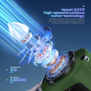 - [Ventilador de cintura portátil totalmente atualizado] Este ventilador de cintura de ponta apresenta a mais recente tecnologia de motor sem escova de 2025, atingindo impressionantes 13.000 RPM — o dobro da velocidade dos ventiladores de correia tradicionais. Projetado com 9 lâminas em espiral e uma estrutura simplificada em forma de foguete, ele minimiza a resistência do ar, fornecendo um fluxo de ar mais focado e poderoso a velocidades de até 20 pés/s. Com um simples toque no botão, você pode desfrutar de uma brisa refrescante e instantânea que o resfria com eficiência, tornando os dias quentes de verão mais confortáveis.