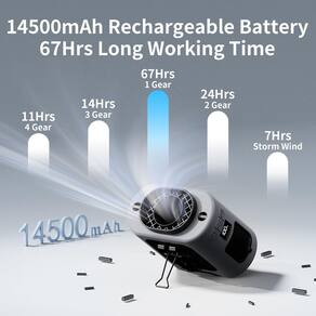 -?Tempo de trabalho de longa duração?O ventilador de cintura portátil pode funcionar continuamente por até 67 horas em baixa velocidade. Leva 6,5 horas para carregar totalmente e suporta o carregamento durante o uso. A velocidade máxima do vento persiste por 8 horas, enquanto a velocidade mínima do vento pode durar até 67 horas, ajudando você a combater o calor durante todo o dia (nenhuma bateria de lítio independente é vendida com o produto)