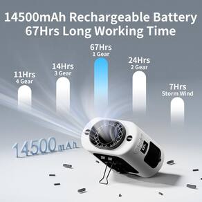 -?Tempo de trabalho de longa duração?O ventilador de cintura portátil pode funcionar continuamente por até 67 horas em baixa velocidade. Leva 6,5 horas para carregar totalmente e s