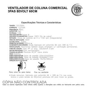 Ventilador de Coluna Comercial 3 Pás Bivolt Q600c NY 60cm Qualitas
