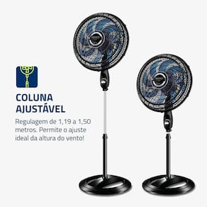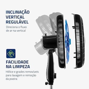 Recursos Adicionais: Coluna ajustável, inclinação vertical regulável, oscilante, grade frontal removível, porta-fio.