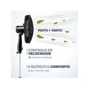 Além disso, o ventilador conta com um sistema oscilante contínuo, que amplia o raio de alcance do vento no ambiente, permitindo uma de ar mais eficiente nos cômodos da casa. A inclinação vertical regulável permite direcionar o fluxo do ar de forma ideal. E, com três opções de velocidade, é possível adequar o vento às suas necessidades: Máxima Turbo, Média Conforto e Mínima Silencioso.