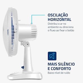 O sistema de oscilação horizontal amplia o alcance da ventilação, enquanto o botão de trava permite manter o ar direcionado.