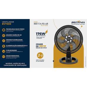 O Ventilador de Mesa Britânia de 58cm Maxx Force BVT500 conta com 3 velocidades , hélices de 6 pás, potência de 150W, além de porta-fio e motor com fusível térmico de segurança. Para facilitar, o Ventilador de Mesa Britânia de 58cm Maxx Force oferece alça na grade traseira.