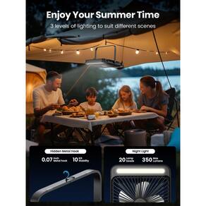 - Design compacto e portátil com suporte dobrável: medindo apenas 4,5 cm de espessura e pesando apenas 800 g. Equipado com um suporte dobrável, o ventilador pode ser facilmente posicionado e ajustado para direcionar o fluxo de ar onde você mais precisa. Cabe facilmente em mochilas, tendas e outros espaços apertados. O design que economiza espaço elimina o volume dos ventiladores de acampamento tradicionais, permitindo que você aproveite o conforto fresco sem o incômodo