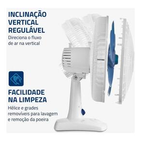 Especificações: Voltagem: 220V Potência: 60W Cor: Branco 3 Velocidades 6 Pás Inclinação regulável Sistema Oscilante Contínuo Baixo ruído Grade frontal removível Alça de transporte e porta-fio Diâmetro: 30cm Dimensões: 51x35x28 cm (AxLxP)