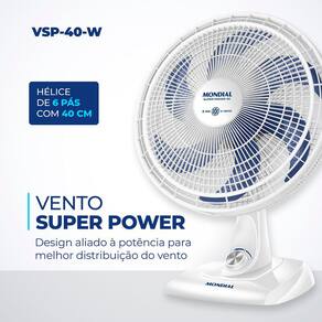 Com 40cm e 3 velocidades, o Ventilador de Mesa Mondial 6 Pás Super Power VSP-40-W garante vento mais forte. Ele tem baixo nível de ruído, sistema oscilante lateral, inclinação vertical regulável, além ser compacto e ter baixo consumo. Sua hélice tem design aerodinâmico, o que proporciona um vento forte.