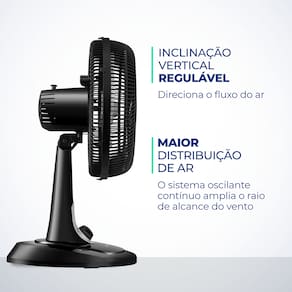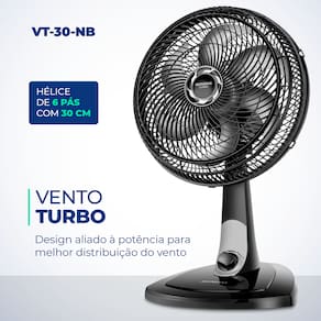 O Ventilador Mondial Turbo VT-40-NB é vento mais forte. Ele tem baixo nível de ruído, sistema oscilante lateral, inclinação vertical regulável, além ser compacto e ter baixo consumo. Sua hélice tem design aerodinâmico, o que proporciona um vento forte. Para ambientes mais amplos, você pode usar seu sistema oscilante. A inclinação vertical regulável direciona o fluxo de ar para cima ou para baixo. A grade frontal é removível e fácil de montar e desmontar para limpar. Possui alça para transporte e base antiderrapante para mais segurança.