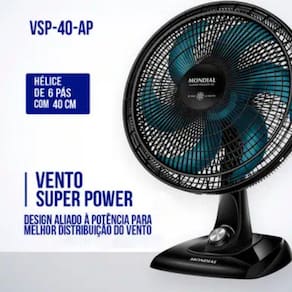 Características: Marca: Mondial Modelo: Super Power VSP-40-AP Tipo: Ventilador de mesa Diâmetro: 40 cm Pás: 6 pás Velocidades: 3 velocidades Acionamento: Manual Nível de ruído: Baixo Repelente: Não Luminária: Não Timer: Não Potência: 140 W