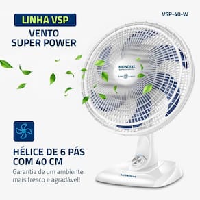 O ventilador Super Power VSP-40-W possui 40 cm de diâmetro e hélice com 6 pás, garantindo um ambiente mais refrescante e agradável. Já o sistema de ventilação da Mondial apresenta baixo nível de ruído e assegura o silêncio necessário para momentos de concentração e uma excelente noite de sono. Saiba mais sobre o VSP-40-W: