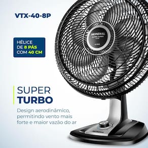 O Ventilador de Mesa Super Turbo VTX-40-8P da Mondial possui 40 cm de Diâmetro e Hélice de 8 pás, o que promove uma circulação de ar mais eficiente e garante mais frescor ao ambiente. O sistema de ventilação alia a potência para refrescar ao baixo nível de ruído, proporcionando o silêncio necessário para momentos de concentração e uma excelente noite de sono.