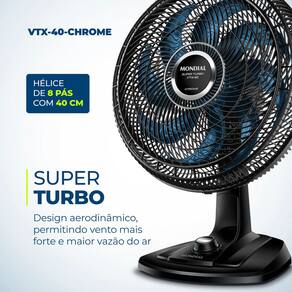Com 40 CM, 8 PÁS azuis e 3 VELOCIDADES, o Ventilador Super Turbo VTX-40-CHROME preto é MUITO MAIS VENTO. Ele tem BAIXO NÍVEL DE RUÍDO, SISTEMA OSCILANTE lateral, INCLINAÇÃO VERTICAL REGULÁVEL, além de ser super prático e potente. É o 1º VENTILADOR COM 8 PÁS DO BRASIL. Sua hélice tem design aerodinâmico, o que torna o AMBIENTE MAIS FRESCO E AREJADO. Ele faz MENOS BARULHO: com qualquer uma das 3 VELOCIDADES você dorme com ventinho e silêncio garantidos. Para AMBIENTES MAIS AMPLOS você pode usar seu SISTEMA OSCILANTE. Já sua INCLINAÇÃO VERTICAL REGULÁVEL DIRECIONA O FLUXO DE AR para cima ou para baixo. Como a grade frontal é removível, ele ainda é FÁCIL DE MONTAR E DESMONTAR para limpeza. FÁCIL DE CARREGAR e SEGURO: ele tem alça para transporte e a BASE ANTIDERRAPANTE traz mais segurança. O Ventilador 40 cm Super Turbo 8 Pás VTX-40-CHROME foi desenvolvido para USO DOMÉSTICO, sendo melhor para uso residencial. 1 ANO DE GARANTIA MONDIAL. A Mondial é a escolha de milhões de consumidores.