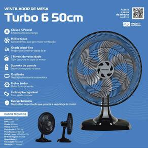 Ventilador de Mesa Ventisol Turbo 6 50CM, 6 Pás, 3 Velocidades, Suporte de Parede Integrado - 110V