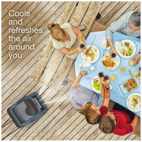 Compacto e Portátil: Com perfil baixo para maior estabilidade ao ar livre, este ventilador de nebulização é fácil de transportar graças à alça ergonômica. A montagem é simples e o kit de nebulização pode ser removido sem o uso de ferramentas para facilitar a limpeza.
