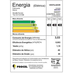 O ventilador de parede Smart Control , oferece modernidade ,conforto, praticidade e controle total sobre o calor. O único do mercado com oscilação que pode ser controlada, a direção por seu controle remoto, além das velocidades para comodidade. O sistema Smart Swing controla a velocidade de oscilação independente da velocidade desejada no ventilador. Potência de 140W, grade em sistema especial TS e hélice de 15 pás. Tem oscilação horizontal, inclinação vertical, grade removível para limpeza.