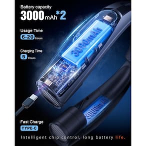 -?Bateria independente e funcionamento duradouro?A bateria de polímero de lítio recarregável dupla embutida de 3000 mAh com tecnologia avançada de íon de lítio faz com que este ventilador de pescoço crie uma brisa refrescante de forma eficaz e minimize a perda de energia. Um único carregamento completo fornece até 20 horas de operação contínua na velocidade mais baixa ou 6 horas na velocidade mais alta.