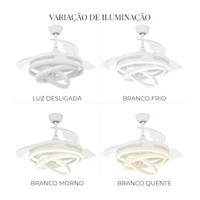 O modelo 001W une leveza e modernidade em um design clean. Suas pás retráteis e o LED integrado tornam qualquer ambiente mais elegante e confortável. 💡 LED 48W com 3 tons de luz (quente, neutro e fria) 💨 Motor DC 80W silencioso e econômico 📏 Ø108 cm ligado / Ø48 cm desligado Ideal para ambientes de até 20 m². Inclui controle remoto, manual e garantia.