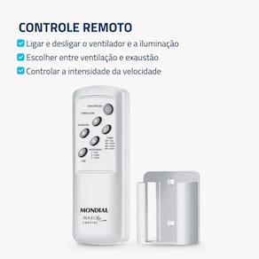 Principais Características: Hélice integrada com design aerodinâmico Maior fluxo de ar e melhor ventilação Controle remoto para ventilador e iluminação Função ventilação e exaustão 3 velocidades: Máxima, Média e Mínima Funcionamento silencioso Produto pré-montado com instalação fácil Motor de duplo rolamento para maior durabilidade Iluminação com globo decorativo Ideal para otimização de espaço 1 ano de garantia Mondial