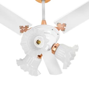 Ventilador De Teto Venti-Delta New Zeta 3 Pás Laqueada Branco/Cobre 220V Características Gerais do Produto: Dimensões AxLxP cm : 56 X 96 Produzido em: Aço, Plástico e Mdf Voltagem: 220V Cor Acabamento: Branco / Cobre Potência: 130W : 1 ano junto ao fabricante Aplicação: Teto Acompanha Lâmpada: Não Rotação Máxima: 180 A 460 RPM Área Abrangente: 20 m Material das Pás: MDF Cor das Pás: Branco Peso: 3,565 Kg Acabamento Iluminação: 3 Tulipas em Plástico Injetado Tipo de Iluminação: 3 Lâmpadas até 15W Acompanha o produto: 01 Ventilador Completo 01 Kit Instalação 01 Manual de Instalação 01 : 1 ano junto ao fabricante