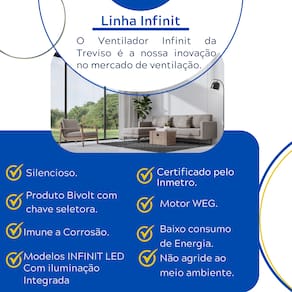 A Treviso revoluciona o mercado com o lançamento do Ventilador de Teto Infinit LED, que combina um sistema de ventilação inovador e acabamento sofisticado. Combinando tecnologia de ponta, design moderno e eficiência, é a escolha perfeita para decorar, iluminar e ventilar o seu ambiente.   Destaques do Produto:   Super Silencioso: Proporciona um ambiente tranquilo, sem interferir no sono. Tecnologia de Motor WEG Bivolt: Baixíssimo consumo de energia, garantindo economia e eficiência. Durabilidade Superior: Fabricado com materiais de alta qualidade, é extremamente resistente e oferece um excelente custo-benefício. Iluminação LED Integrada: Plafon com iluminação LED que proporciona um ambiente mais iluminado e aconchegante. Consumo Energético Mínimo: Reconhecido por ter o menor consumo de energia do mercado.   Informações Adicionais:   Produto 100% Nacional Fabricante com Mais de 40 Anos de Experiência no Mercado   Especificações Técnicas:   Voltagem: Bivolt (110V / 220V) Fácil Instalação: Rápida e prática, ideal para qualquer ambiente. Iluminação 360° Decorativa: Proporciona uma luz homogênea e agradável. Imune à Corrosão: Feito com materiais que garantem durabilidade e resistência. Desempenho Ideal: Ótimo para ambientes de até 40m².   Componentes:   Motores: Dois motores WEG de alta resistência, cada um com 1/30 W de potência. Hélices: Duas hélices com 250mm de diâmetro. Rotação: Aproximadamente 1.650 RPM em 115/230V. Comutação: Bivolt, com chave deslizante no corpo central. Fixação: Barra de alumínio de 400mm para instalação no teto. Peso Total: 5kg (sem embalagem). Sistema de Giro: Aproximadamente 10 rotações por minuto. Iluminação: Plafon borda infinita com 24W, luz neutra de 4000k e 17cm de diâmetro. Dimensões: Comprimento de 90cm e altura de 26cm.   Controles:   Chave de parede: com dimer e interruptor liga/desliga para iluminação.   Recomendações de Limpeza: Utilize um pano umedecido. Evite produtos de limpeza abrasivos.   Experimente o Ventilador de Teto Treviso Infinit LED e transforme o seu ambiente com um toque de elegância, eficiência e modernidade.