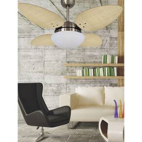 Especificação técnica: Marca: Volare Modelo: VD42 Pétalo Palmae Quantidade de Pás: 4 Estrutura das Pás: Pás em MDF laqueada, revestida em palha Cor das Pás: Natural Corpo: Bronze Voltagem: 127v Acionamento: Controle de parede opcional controle remoto vendido separadamente Numero de Velocidades: 3 Potência do Motor: 127w ?frequência: 60Hz RPM do Motor: 404 Área de Vazão: 2,17 m/s Selo Procel Economia de Energia : B Soquete de Lâmpada: 2 x E27 Luminária: Vidro Acetinado com Acabamento Fosco Ajuste de altura: Não Silencioso: Sim Função Exaustão e Ventilação: Sim Dimensões do ventilador: 48cm de altura x 105 de diâmetro