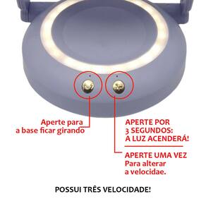 Ventilador possui led em sua base, que ilumina o ambiente e facilita para fazer maquiagens, leituras e outros.