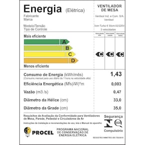 Ar mais refrescante para você e sua família.Se você deseja um ambiente mais refrescante e agradável, o Ventilador de Mesa Ventisol Turbo 6 30cm é perfeito.Seu Motor Turbo junto com sua hélice de 6 pás com nova aerodinâmica são silenciosos e geram uma maior ventilação no aparelho. Nova Base design moderno e arrojado. Maior estabilidade para o ventilador. Motor Turbo, com alta performance. Gera menos ruído. Hélice 6 Pás com nova aerodinâmica. Gera mais ventilação. Chave de Ligação no Capacete Mais praticidade para o uso. Grade Fechada mais segurança para a família. Oscilação Horizontal Proporciona um fluxo de ar mais distribuído por todo o ambiente. Regulagem de inclinação manual, ajustada de acordo com a necessidade. Três Velocidades você poderá escolher a que mais agrade. Suporte de parede integrado, pode ser usado no chão, na mesa ou na parede em algum ponto de fixação.