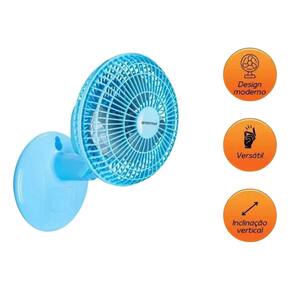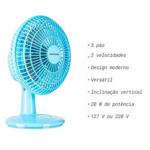 Especificações técnicas: Motor Forte: Maior fluxo de vento com mais economia; Hélice 3 pás: Design e aerodinâmica para alta ventilação; Duas velocidades: Controle de velocidade; Articulação vertical: Ajustada de acordo com a necessidade; 2 em 1: Mesa e parede;