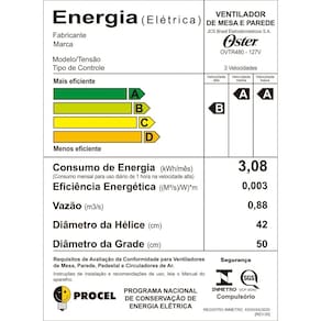 Especificações Técnicas - Cor: Preto - Modelo: OVTR480 - Potência: 126W - Consumo: 0,126kWh - Diâmetro da Hélice: 42cm