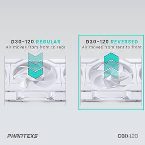 - A iluminação D-RGB é integrada e visível de todos os lados do ventilador D30-120. As lâminas refletem a luz proveniente do anel de iluminação Halos dentro da moldura. Compatível com placas-mãe equipadas com Digital-RGB e produtos Phanteks Digital-RGB.