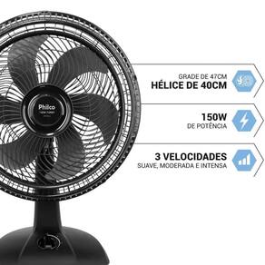 Marca: Philco Modelo: PVT41A Voltagem: 127V e 220V (Escolher no ato da compra) Tipo: Ventilador 2 em 1 (Mesa e Coluna) Potência: 150W Tecnologia: Maxx Force Velocidades: 3 níveis de intensidade (mínima, média e máxima) Diâmetro da hélice: 40 cm Oscilação automática lateral Inclinação regulável Consumo: 0,15 kWh Material: Plástico resistente e de fácil limpeza Níveis de velocidade: 3 Base: larga e estável