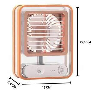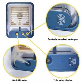 Ventilador Portátil de Mesa Mini Ar Condicionado Umidificador Climatizador Pode Colocar Gelo Luz Led Com um design moderno e compacto, o Mini Ventilador Portátil é perfeito para quem está em movimento, além de ser muito silencioso. Ideal para uma noite de sono repousante ou de trabalho ou estudo ininterrupto. Melhor ainda, seu ventilador silencioso não será uma distração, garantindo que você permaneça focado, tranquilo e produtivo. Carregamento USB, e com três níveis de velocidade, este ventilador ajuda a resfriar, umidificar e purificar para obter ar fresco e limpo a qualquer hora, em qualquer lugar. Recomenda-se o uso de água gelada ou cubos de gelo para um melhor efeito de resfriamento. O ventilador possui uma seleção livre de direção do vento. O ângulo pode ser ajustado livremente para atender a diferentes posições e aproveitar a brisa. Além de conter uma luz interna, de uso opcional, que deixa o ambiente muito agradável.
