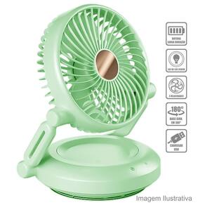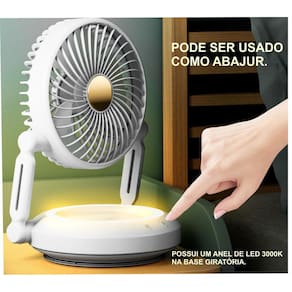 Especificações técnicas; . Fabricado em Plástico ABS . Carregamento USB . Base Giratória 180 . Anel de LED 3000k . 3 Níveis de Velocidade . Hastes ajustáveis e dobráveis . Tamanho Área ventilada 16cm . Tamanho dobrado: 18cm x 16cm . Tamanho expandido: 18cm x 26cm . Carregamento USB tipo C . Entrada carregamento 5v . Bateria 2400mAh . Peso 576grs