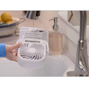 O mini ventilador possui dois jatos de resfriamento umidificante. Proporcionando um ambiente mais fresco. Além de ser giratória, podendo mover para qualquer lado que precisar.