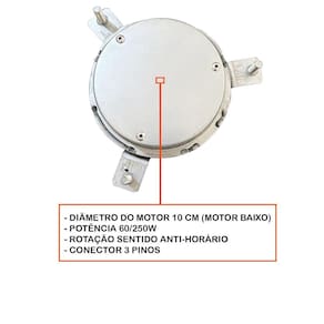 - diâmetro da hélice 34,5 cm - diâmetro do motor 10 cm motor baixo - hélice com 7 pás - potência 60/250w - rotação sentido anti-horário - conector 3 pinos - pá invertida