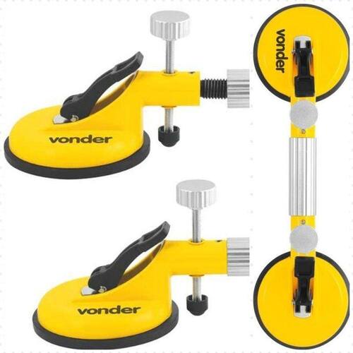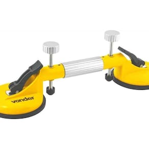 DESTAQUES DIFERENCIAIS 35.99.102.102 Ventosa dupla ajustável, VONDER.A capacidade de carga de cada ventosa é de 80 kgf e a capacidade de junção/posicionamento é de 100 kgf.APLICAÇÕES/DICAS DE USO Indicada para ajustar a altura/alinhamento e fazer a junção de pedras com superfícies lisas, como: cerâmica, granito, entre outros. Pode também ser usada para elevar e movimentar peças planas com superfície lisa, como: vidros, espelhos, cerâmicas, entre outras, desde que em distâncias curtas. Ao fazer elevação/movimentação, cerifique-se de que o manípulo de aperto esteja fechado para evitar o desgaste dos parafusos e possíveis acidentes.CARACTERÍSTICAS Tipo da ventosa Dupla ajustávelMaterial da ventosa BorrachaMaterial do suporte e alça da ventosa AlumínioDiâmetro de cada ventosa 120 mmCapacidade total de carga da ventosa 160 kgfMassa aproximada (peso) (kg) 1,14 kgTipo da Embalagem Blister1 Ventosa dupla. Acompanha: 1 conjunto de proteção dos parafusos.
