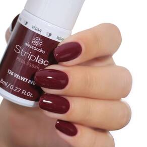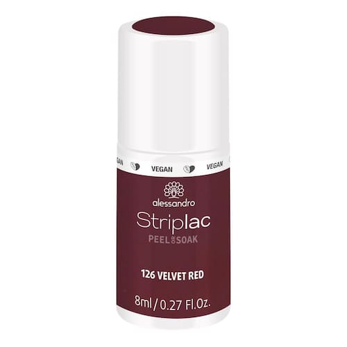 Esmalte alessandro Striplac Peel or Soak — 126 veludo vermelho para mulheres — 0,27 onças — Cor de longa duração. Nosso esmalte inovador oferece cores que levam menos de 15 minutos para serem aplicadas, mas duram até 3 vezes mais do que o esmalte convencional. Desfrute de uma manicure de alto brilho e qualidade que permanece até o último dia.
