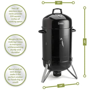 Dois racks de aço inoxidável de 18 fornecem 510 polegadas quadradas de espaço para cozinhar Taça de água esmaltada em porcelana. Dimensões 22 C x 24 L x 43 A polegadas As aberturas superior e inferior fornecem um sistema duplo de ventilação Base de travamento Porta com dobradiça vertical. Pés Cúbicos MC 5,54 Marca: Não Informado