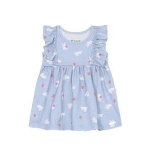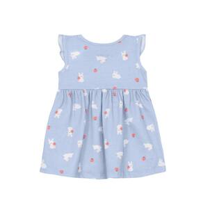 Vestido bebê menina confeccionado em malha, possui estampa divertida de coelhinhos que traz um toque lúdico. As mangas curtas com babados e a gola redonda adicionam charme, enquanto as pregas na extensão garantem um efeito rodado adorável. Ideal para os dias quentes, proporciona conforto e liberdade de movimento.