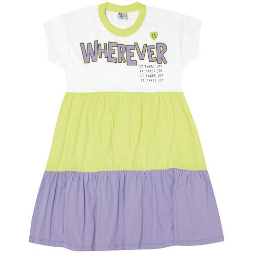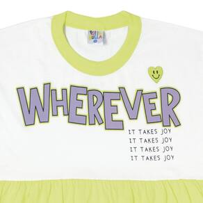 Um vestido lindo inspirado nas cores da primavera. Confeccionado em Meia malha nas cores Branco, verde e roxo com a estampa “Onde estiver é preciso alegria”. Um vestido perfeito para monta vários looks a cara da primavera, sem perde o conforto, leveza e charme.\n