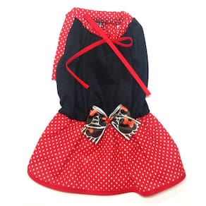Vestido De Verão Para Cachorro Preto Com Laço Da Minnie - G - Ideal para o Verão; - Corpo, confeccionado em malha PV na cor preta. - Saia, confeccionada em tricoline na estampa vermelho poá; - Acabamento em viés; - Laço confeccionado na fita com estampa da Minnie; - Modelo prático e leve para o seu pet; Tabela de medidas: G - 37 cm de comprimento, 50 cm de circunferência Abdominal, 30 cm de circunferência de Pescoço. Cor: preta com saia vermelha O tecido é leve e confortável e não aquece o cão, pode ser em dias de verão, porém caso esteja muito sol não recomendamos nenhuma vestimenta na sua cachorrinha. Também recomendamos a utilização desse vestido nos dias de primavera ou início de inverno. Marca: Não Informado