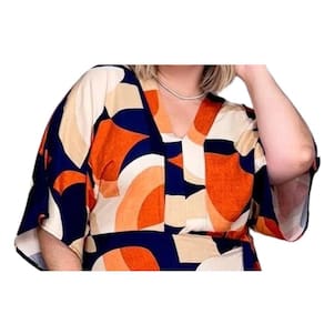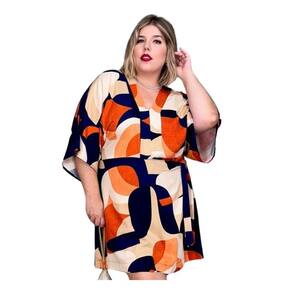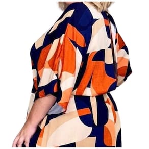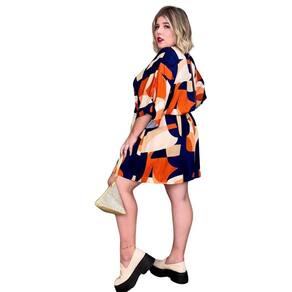 Descrição: Vestido em viscose sarjada estampado, manga ampla, decote em V profundo, fenda nas costas, saia com sobreposição e amarração. Com elástico nas costas e forrado