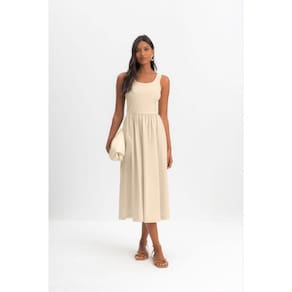 Encante-se com o vestido midi feminino Essendi, uma peça que une estilo e conforto. Confeccionado em ribana canelada, ele apresenta mangas estilo regata e um delicado decote em U, que valoriza a silhueta. As pregas na cintura criam um efeito rodado, perfeito para qualquer ocasião. Ideal para compor looks elegantes ou casuais, combine com sandálias ou tênis para um visual despojado. Sinta-se confiante e radiante com essa escolha única! Marca: Não Informado