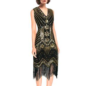 - Design: design listrado clássico dos anos 20 com detalhes de lantejoulas e miçangas para um padrão encantador. Design profundo com decote em V na frente e atrás; estilo colado ao corpo; comprimento midi; alças sem mangas e ajustáveis; totalmente forrado com lantejoulas e contas.