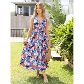 Flessibili Vestido longo feminino 2025 verão sem mangas gola V Boho estampa floral praia maxi vestidos de verão azul rosa floral GG