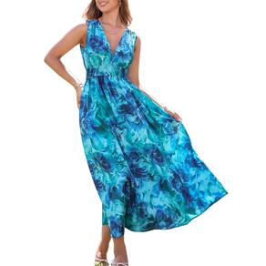 Vestido longo feminino Flessibili 2025, verão, sem mangas, decote em V, boho, estampa floral, praia, maxi, azul lago, floral, pequeno