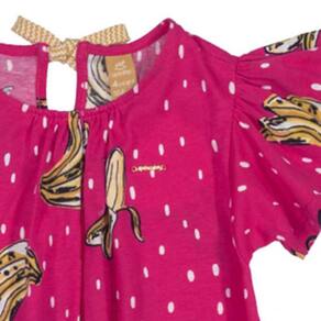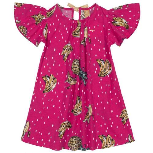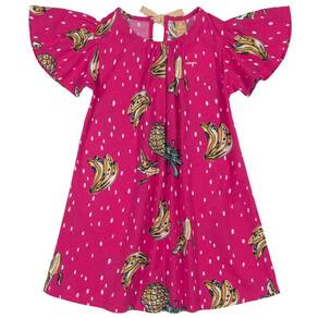 Vestido Infantil em meia malha super leve e confortável. Solto, com mangas com babados e estampa de bananas e abacaxis retrô, é perfeito para a primavera e verão.
